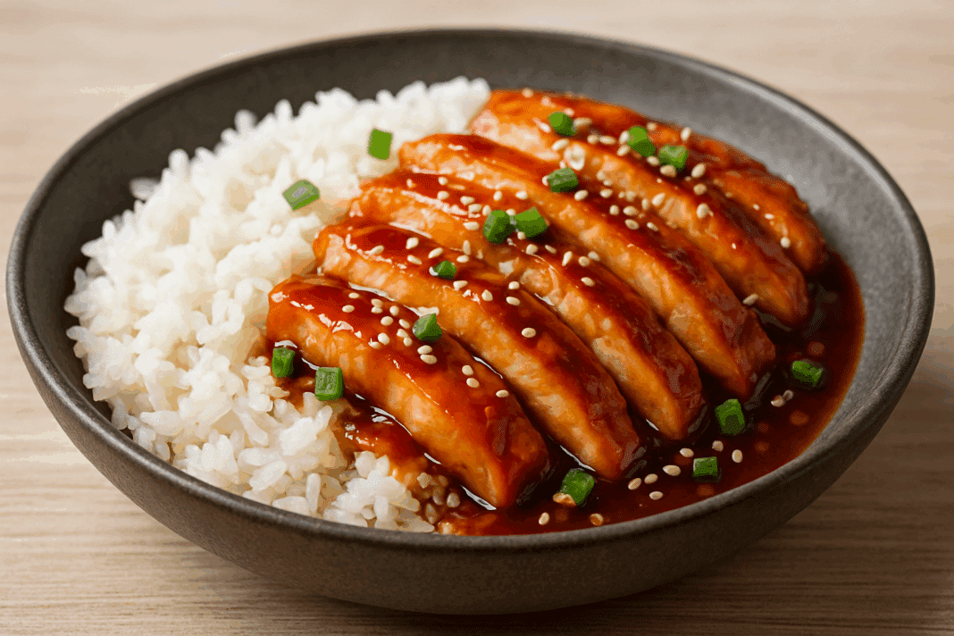 Βάλε το ρύζι στο πιάτο, πρόσθεσε από πάνω το κοτόπουλο και γαρνίρισε με σουσάμι και φρέσκο κρεμμυδάκι.