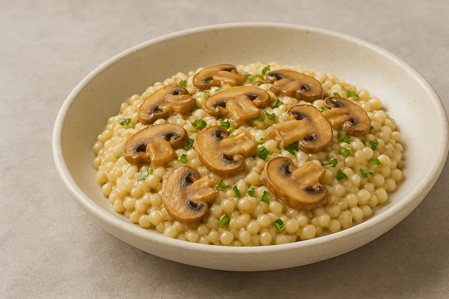 Το «ριζότο» με κους κους είναι μια πρωτότυπη παραλλαγή του κλασικού ιταλικού πιάτου, που συνδυάζει τη βελούδινη υφή και τη βαθιά γεύση ενός ριζότο, με την ευκολία της παρασκευής του κους κους. Ιδανικό για ένα γρήγορο γεύμα, μαγειρεύεται με σταδιακή προσθήκη ζωμού όπως το παραδοσιακό ριζότο, προσφέροντας γευστική απόλαυση με λιγότερο κόπο. Συνδυάζεται τέλεια με μανιτάρια, αρωματικά βότανα και λίγο τυρί για επιπλέον νοστιμιά.