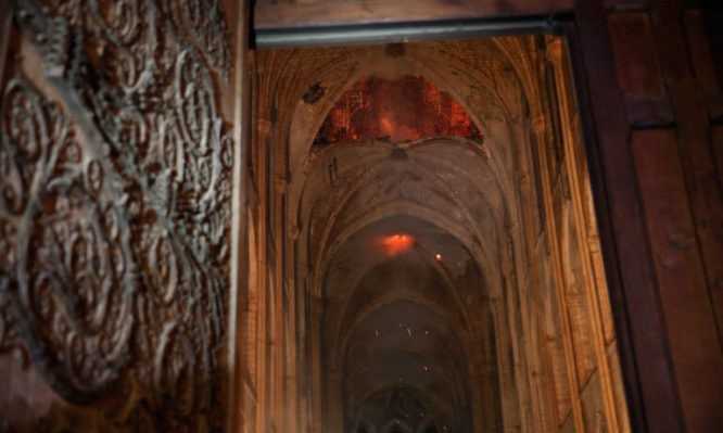«Όλα τα βλέμματα στράφηκαν στο πιο ψηλό μέρος της εκκλησίας. Αυτό που έβλεπαν ήταν κάτι συγκλονιστικό. Μια μεγάλη φλόγα υψωνόταν ανάμεσα στους δυο πύργους με ανεμοστρόβιλους και σπινθήρες, μια τεράστια και αναξέλεγκτη φλόγα η οποία πότε φαινόταν και πότε χανόταν από τον πυκνό καπνό».