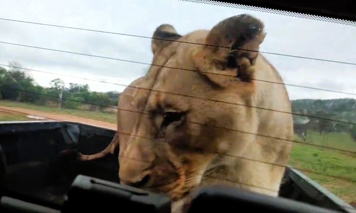 Δύο φίλοι έμειναν άφωνοι όταν μια λέαινα σκαρφάλωσε στο φορτηγό τους κατά τη διάρκεια σαφάρι.