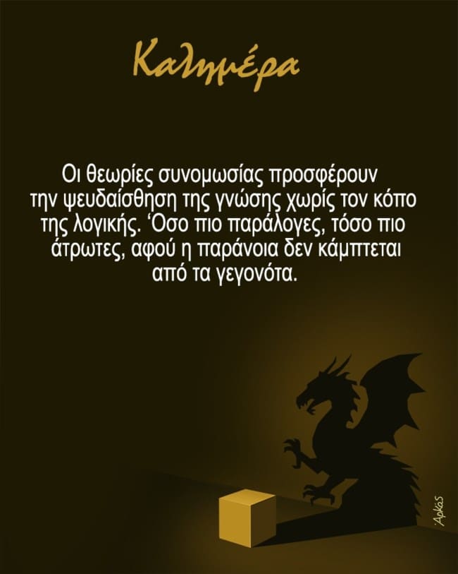 Η φράση που συνοδεύει την εικόνα είναι αποκαλυπτική: «Οι θεωρίες συνωμοσίας προσφέρουν την ψευδαίσθηση της γνώσης χωρίς τον κόπο της λογικής. Όσο πιο παράλογες, τόσο πιο άτρωτες, αφού η παράνοια δεν κάμπτεται από τα γεγονότα.»