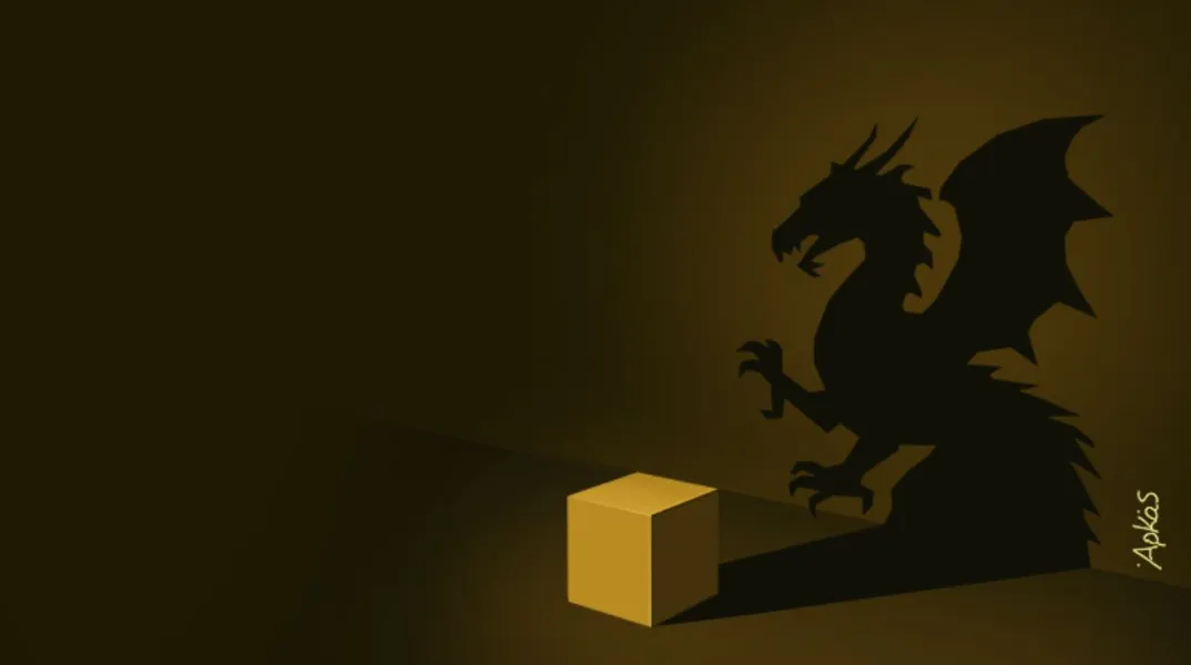 Το εν λόγω σκίτσο απεικονίζει έναν απλό κυβοειδές αντικείμενο να ρίχνει σκιά… ενός δράκου, υπονοώντας πώς απλές και συχνά αθώες πληροφορίες μπορούν να μετατραπούν σε τερατώδη ψεύδη μέσω της φαντασίας και της διαστρέβλωσης.