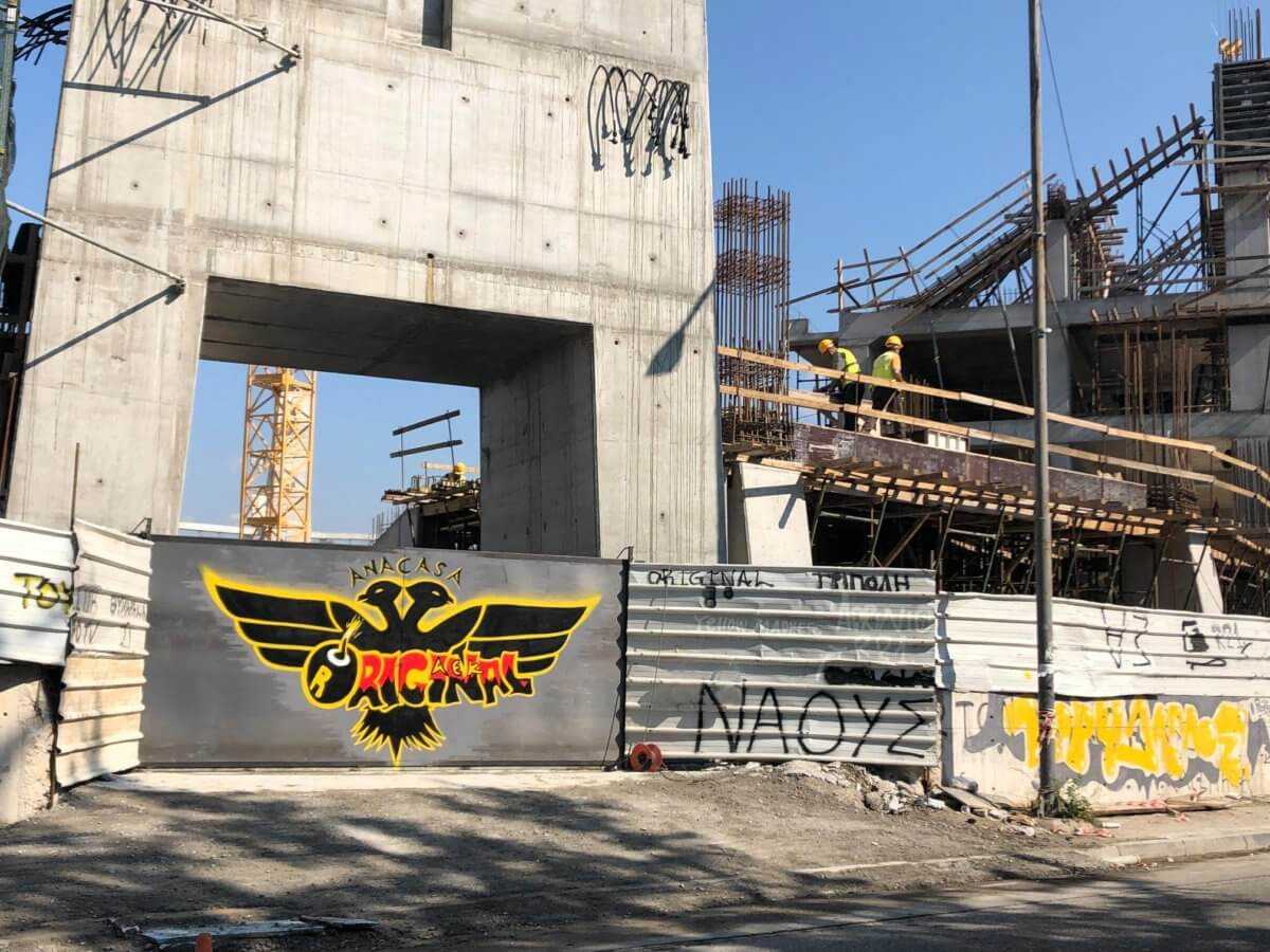 Να αναφέρουμε ότι στον 4ο πυλώνα που ολοκληρώνεται, υπάρχει και η νέα πύλη για την είσοδο στο εργοτάξιο καθώς η παλιά που βρισκόταν στο νότιο πέταλο έχει κλείσει. Εκεί τοποθετήθηκε μια νέα πύλη, στην οποία οι φίλοι της ΑΕΚ έκαναν την… παρέμβαση τους.