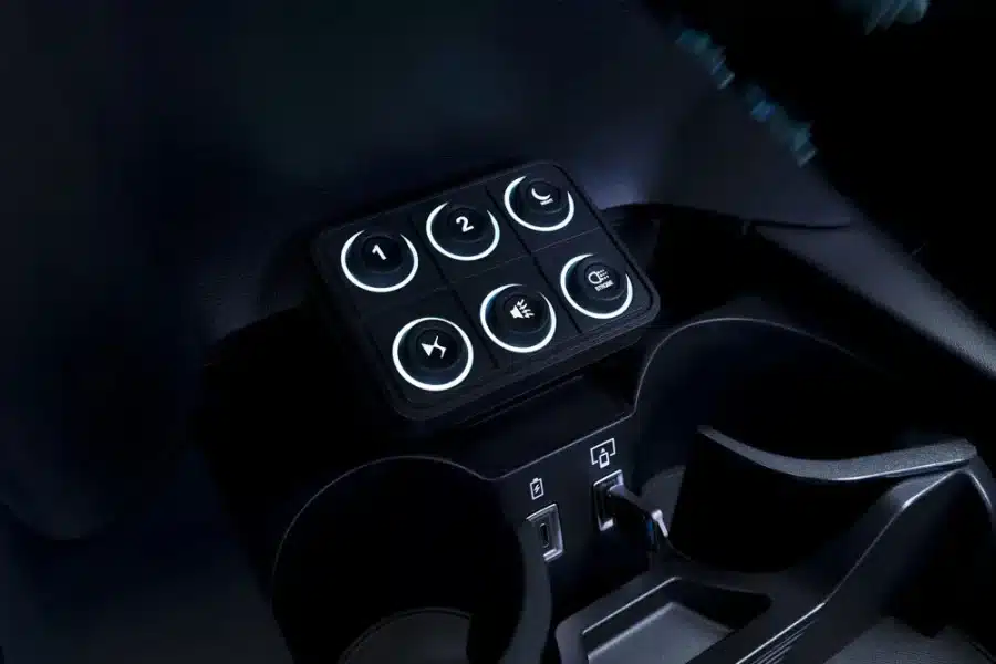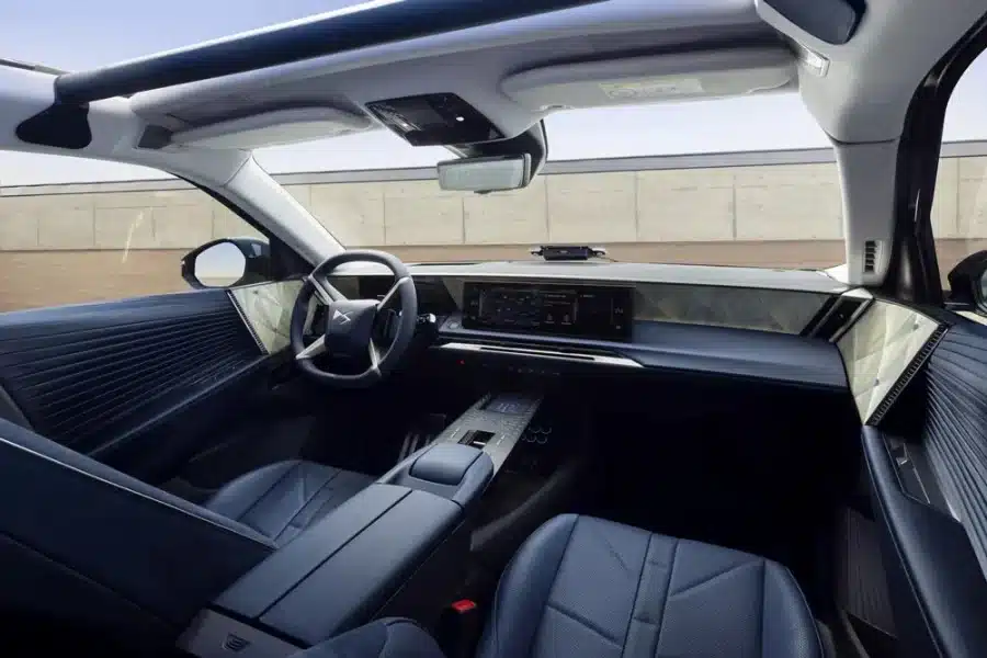 Το εσωτερικό αποπνέει υψηλή αισθητική: διακοσμητικά πάνελ από ψάθα σίκαλης, βαμμένη και επεξεργασμένη με χειροτεχνία, πλισέ σατέν μπλε υφάσματα, ήχο υπογραφής από την Focal, καθώς και καθίσματα με επένδυση Alcantara και δέρμα Nappa, σε μοτίβο εμπνευσμένο από μπρασελέ ρολογιού.
