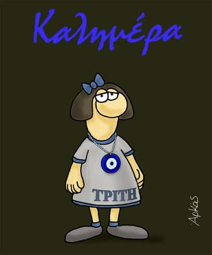Ο Αρκάς, γνωστός για την αιχμηρή του σάτιρα και την ικανότητά του να ασχολείται με έξυπνο τρόπο την καθημερινότητα, δεν θα μπορούσε να μην «σχολιάσει» με τον δικό του μοναδικό τρόπο τη μέρα αυτή. Η γελοιογραφία που επέλεξε για σήμερα απεικονίζει ένα γνώριμο του χαρακτήρα – μια φιγούρα λιτή αλλά γεμάτη υπονοούμενα – να φοράει ένα φυλαχτό με το «μάτι», σύμβολο ενάντια στο κακό και το φθόνο, και ένα φόρεμα που γράφει «ΤΡΙΤΗ», υπογραμμίζοντας τη μέρα.
