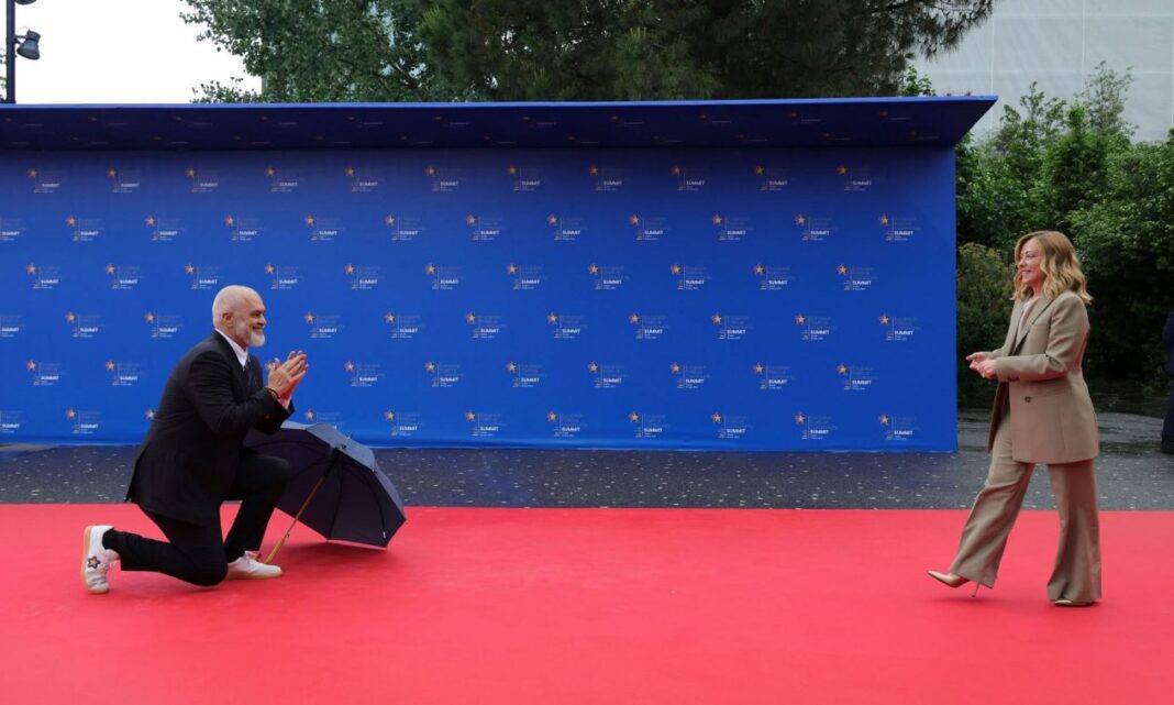 Η Μελόνι περπατούσε στο κόκκινο χαλί, όταν ο Αλβανός πρωθυπουργός απομάκρυνε την ομπρέλα του και γονάτισε μπροστά της.