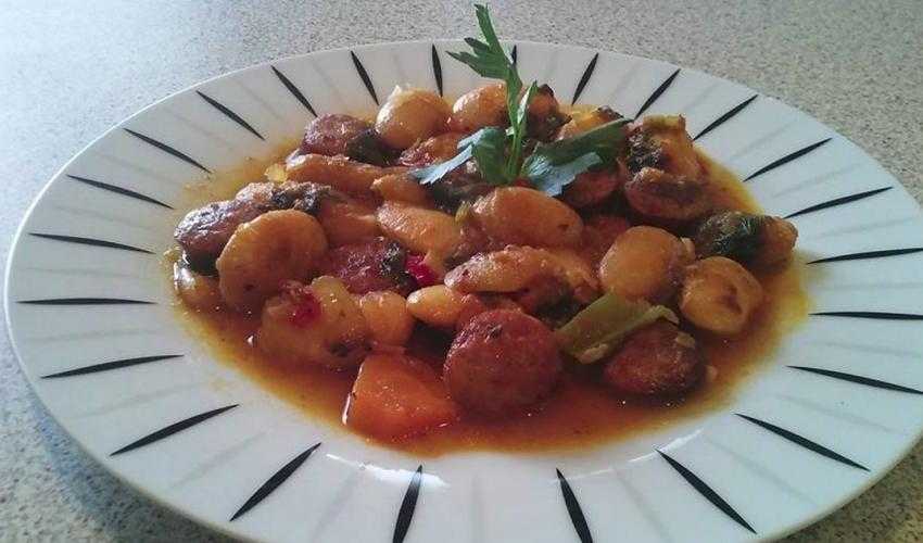 Φασόλια γίγαντες με χωριάτικο λουκάνικο στο φούρνο