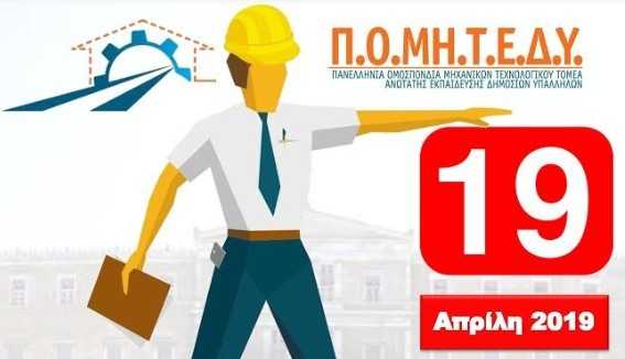 Την Παρασκευή 19 Απρίλη στις 11:00 π.μ. η Πανελλήνια Ομοσπονδία Μηχανικών ΤΕ Δημοσίων Υπαλλήλων (Π.Ο.ΜΗ.Τ.Ε.Δ.Υ.) διοργανώνει συγκέντρωση – παράσταση διαμαρτυρίας των μελών των Διοικητικών Συμβουλίων των Πρωτοβάθμιων Συλλόγων της μπροστά στη Βουλή. Θα ακολουθήσει πορεία προς το Υπ. Διοικητικής Ανασυγκρότησης, το Μ. Μαξίμου και θα καταλήξει στο Υπ. Υποδομών και Μεταφορών.