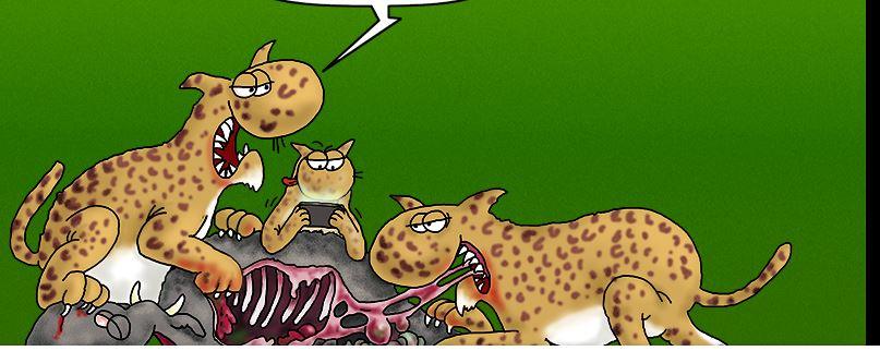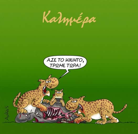 Αρκάς: Σε ένα χιουμοριστικό – αλλά απόλυτα επίκαιρο – σκίτσο του, βλέπουμε μια οικογένεια λεοπάρδαλης πάνω από το γεύμα της. Το μικρό τους, όμως, έχει το βλέμμα του καρφωμένο στο κινητό αντί στο φαγητό. Ο πατέρας ξεσπά λέγοντάς του: «Άσε το κινητό, τρώμε τώρα!»