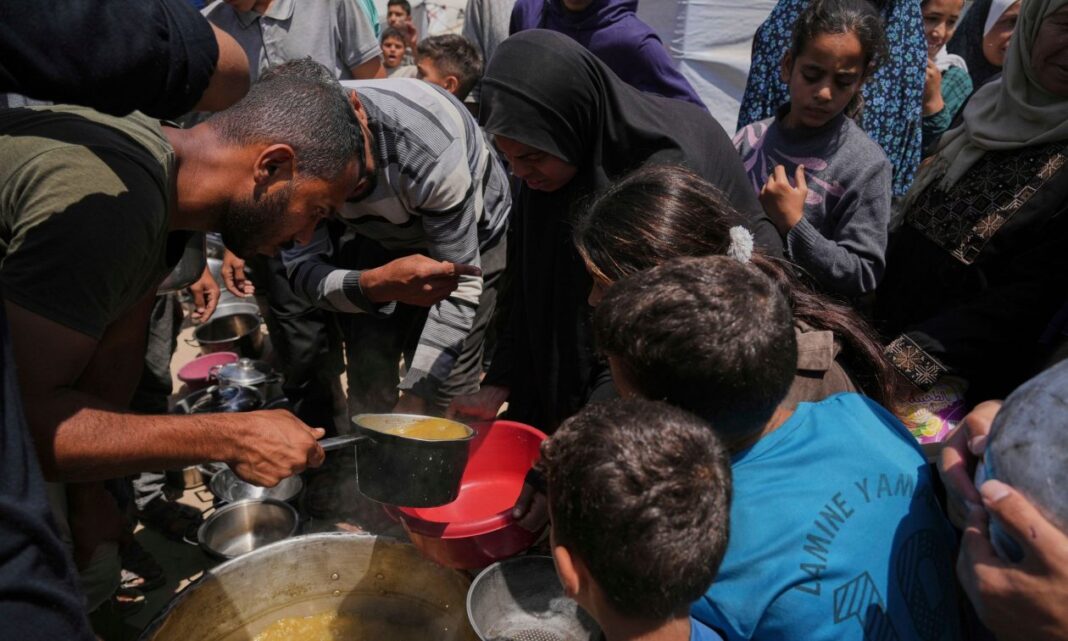 Εκτοπισμένοι Παλαιστίνιοι σχηματίζουν ουρά για να λάβουν δωρεά γεύματα από μια κοινοτική κουζίνα σε έναν καταυλισμό σκηνών στην πόλη της Γάζας, την Τετάρτη 21 Μαΐου 2025