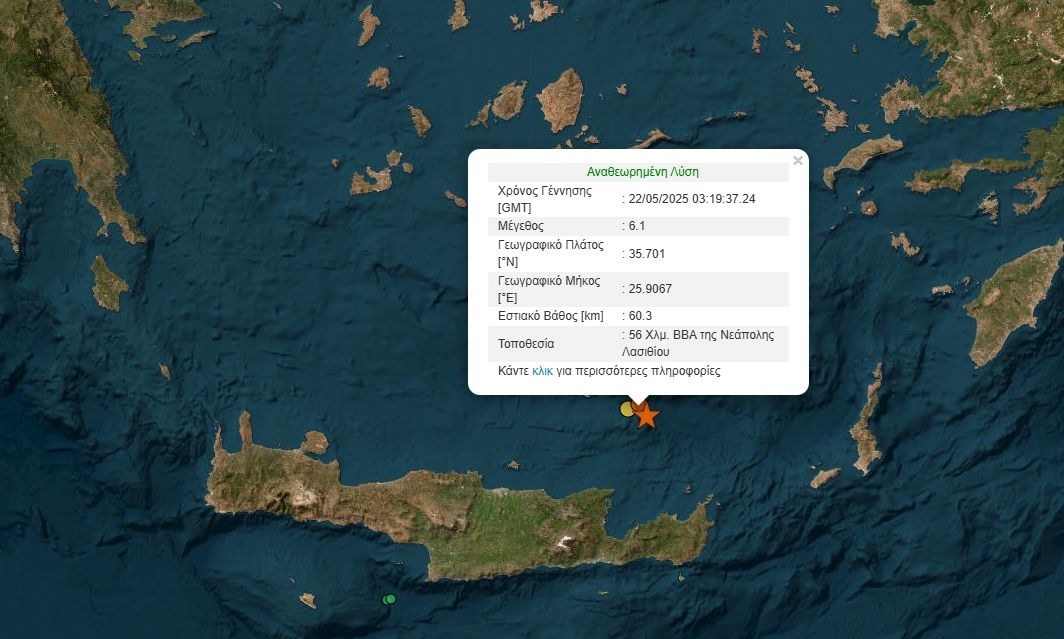 Το επίκεντρο του σεισμού εντοπίζεται στα 55 χιλιόμετρα βόρεια της Νεάπολης Λασιθίου, στην Κρήτη.