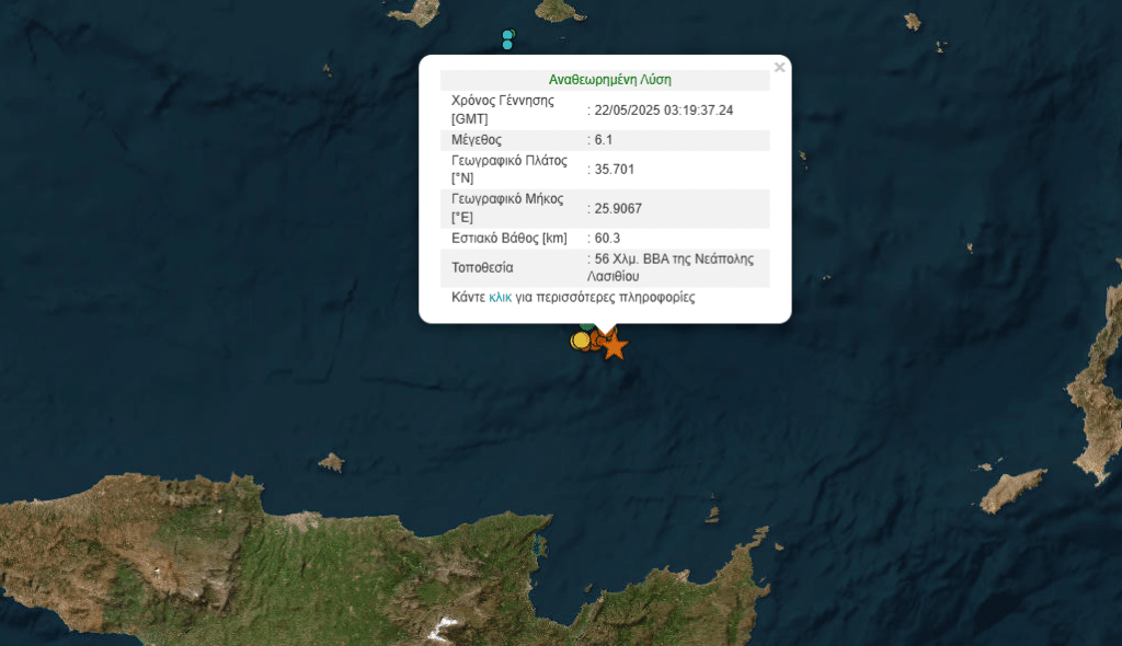 Ισχυρός σεισμός μεγέθους 6,1 βαθμών της κλίμακας Ρίχτερ σημειώθηκε στις 06:19 στα ανοιχτά της Κρήτης. Σύμφωνα με την Αναθεωρημένη Λύση του Γεωδυναμικού Ινστιτούτου Αθηνών το επίκεντρο του σεισμού εντοπίστηκε 56 χιλιόμετρα Βόρεια Βορειοανατολικά της Νεάπολης Λασιθίου και είχε εστιακό βάθος 60,3 χλμ. Λίγα λεπτά αργότερα ακολούθησε μετασεισμός 3,1 βαθμών της κλίμακας Ρίχτερ.