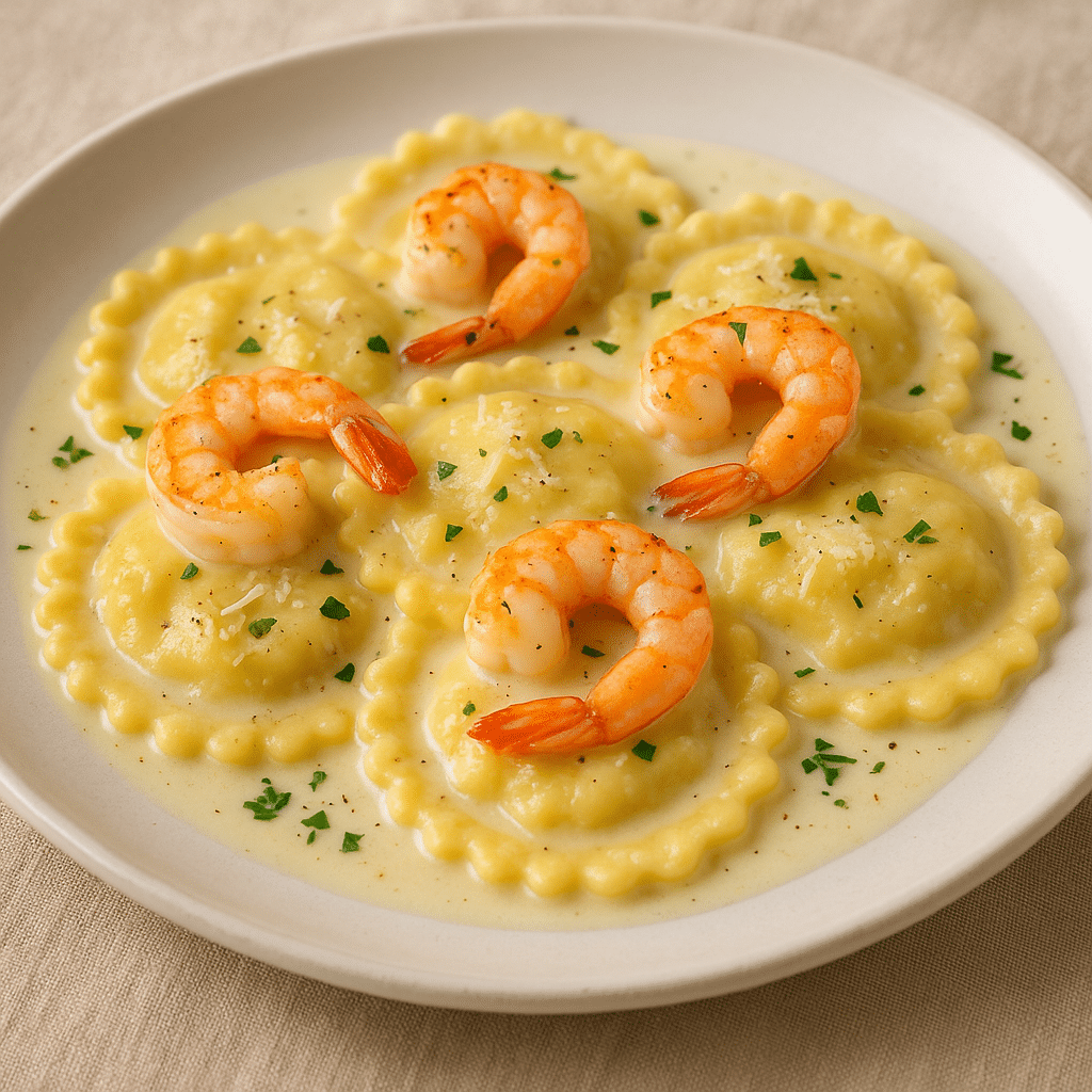 Τα φρέσκα ραβιόλι με γέμιση από γαρίδες συνδυάζονται υπέροχα με μια πλούσια σος από παρμεζάνα και κρέμα, ιδανική για ένα ρομαντικό δείπνο ή ένα ιδιαίτερο τραπέζι.