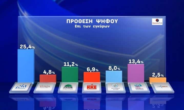 Σημειώνεται ότι το 2.4% δηλώνει άκυρο/ λευκό, το 6.3% αποχή και το 14.9% αναποφάσιστοι.