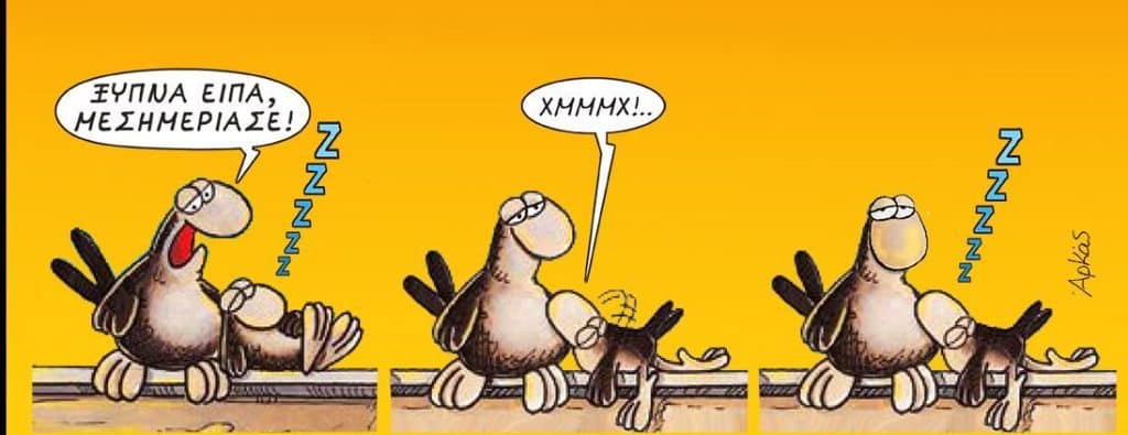 Αρκάς: Μια εικόνα, χίλιες λέξεις – ή, στην περίπτωση του σκιτσογράφου της καρδιάς μας μερικές λέξεις και αμέτρητα χαμόγελα. Στο σημερινό του σκίτσο δύο πουλιά κάθονται στο σύρμα, με το ένα να φωνάζει «Ξύπνα είπα, μεσημέριασε!» και το άλλο να απαντά νυσταγμένα «Χμμμχι!..», προτού ξαναβυθιστεί στον ύπνο. Η σκηνή, όσο αστεία κι αν είναι, αποτυπώνει τέλεια μια γνώριμη πραγματικότητα: το πρωινό ξύπνημα δεν είναι εύκολο για όλους.