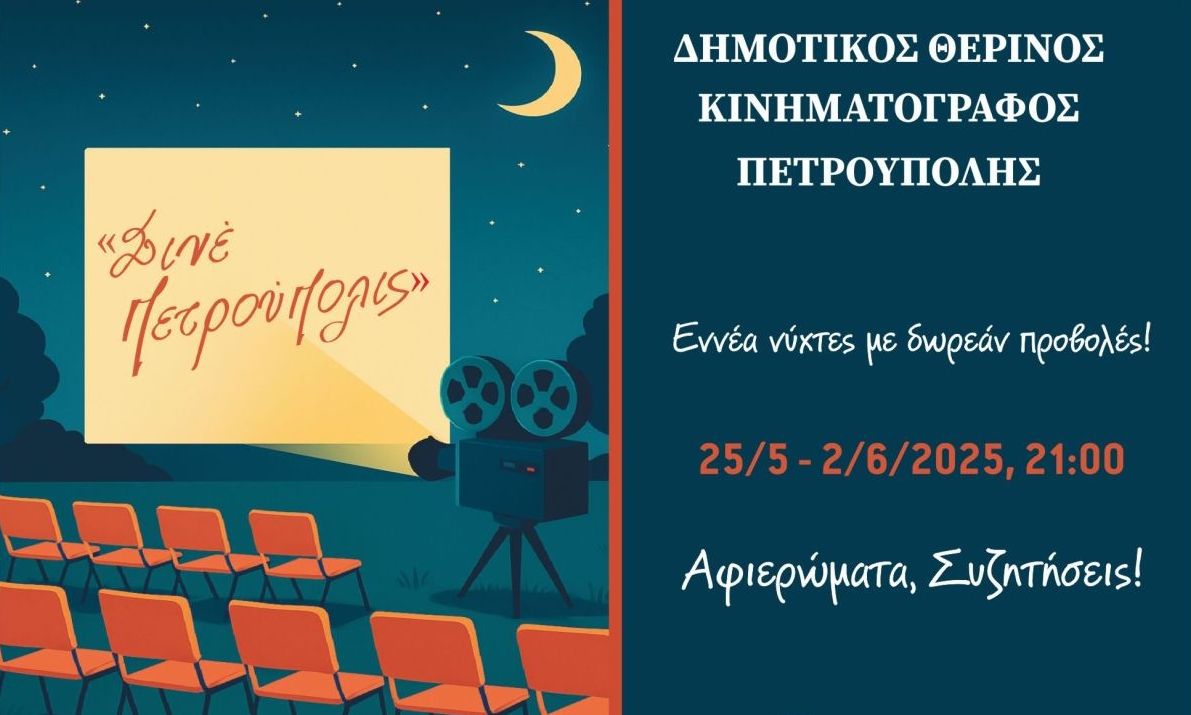 Από σήμερα (25/5, 20:30) και κάθε βράδυ στις 21:00, έως τις 24/9, τα φώτα σβήνουν και ο φιλόξενος χώρος του «Σινέ Πετρούπολις» γίνεται, με προβολές για όλες τις προτιμήσεις, το «όχημα» για «μαγικά ταξίδια», όπως τονίζει ο Δήμος Πετρούπολης στην πρόσκληση.