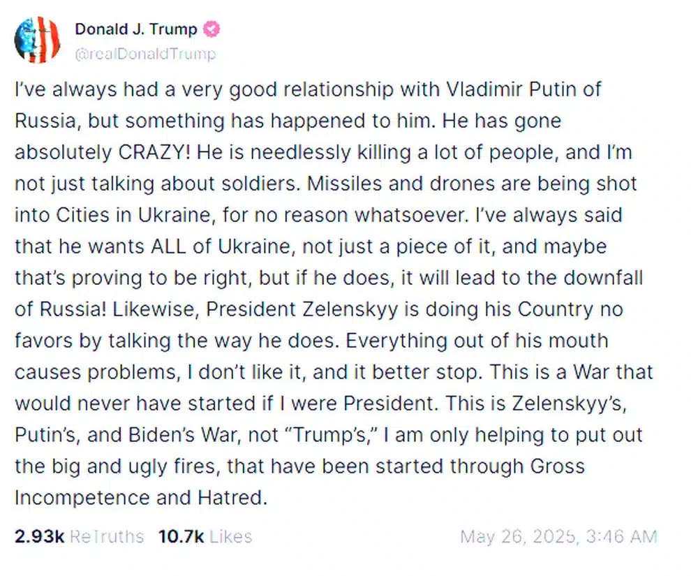Μέσω της πλατφόρμας Truth Social, ο Τραμπ σημείωσε πως παρότι είχε στο παρελθόν καλές σχέσεις με τον Ρώσο πρόεδρο, «κάτι έχει αλλάξει» και «δεν είναι ο ίδιος άνθρωπος». Υποστήριξε πως αν η Ρωσία συνεχίσει με την προσπάθεια να καταλάβει ολόκληρη την Ουκρανία, αυτό θα οδηγήσει στην κατάρρευσή της.