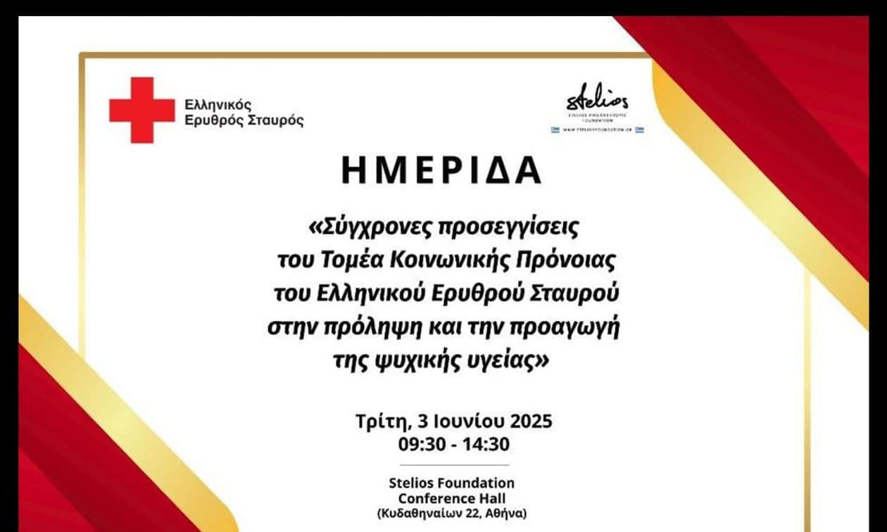 Ο Ελληνικός Ερυθρός Σταυρός διοργανώνει Ημερίδα με θέμα «Σύγχρονες προσεγγίσεις του Τομέα Κοινωνικής Πρόνοιας του Ελληνικού Ερυθρού Σταυρού στην πρόληψη και την προαγωγή της ψυχικής υγείας», η οποία θα πραγματοποιηθεί την Τρίτη, 3 Ιουνίου 2025, από τις 09:30 έως τις 14:30, με την ευγενική χορηγία του Φιλανθρωπικού Ιδρύματος Στέλιος Χατζηιωάννου, στο Stelios Foundation Conference Hall στην Αθήνα (Κυδαθηναίων 22).