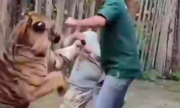 Καθώς ο άνδρας βάζει το χέρι του γύρω από την πλάτη της τίγρης, αυτή τον ρίχνει στο έδαφος και του ορμάει. Ο άνδρας ακούγεται να ουρλιάζει από τρόμο, την ώρα που ο χειριστής προσπαθεί να απομακρύνει το μεγάλο αιλουροειδές από πάνω του και το βίντεο τελειώνει απότομα.