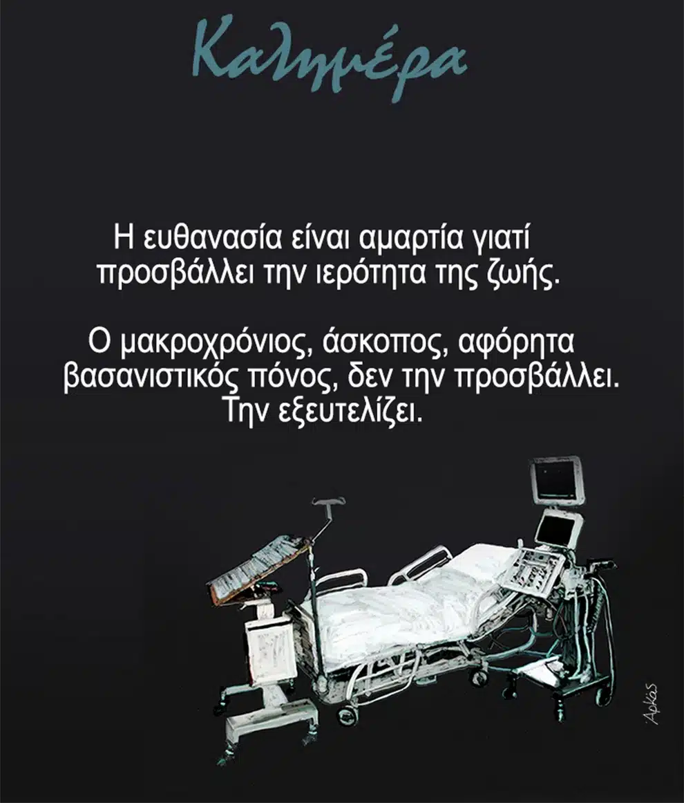 Η συζήτηση γύρω από την ευθανασία είναι μία από τις πιο δύσκολες, συναισθηματικά φορτισμένες και βαθιά φιλοσοφικές συζητήσεις της σύγχρονης κοινωνίας. Ο Αρκάς, με το χαρακτηριστικό του πικρό χιούμορ, άγγιξε αυτήν την ευαίσθητη πτυχή με ένα σκίτσο που προκάλεσε ποικίλες αντιδράσεις: «Η ευθανασία είναι αμαρτία γιατί προσβάλλει την ιερότητα της ζωής. Ο μακροχρόνιος, άσκοπος, αφόρητα βασανιστικός πόνος δεν την προσβάλλει. Την εξευτελίζει».
