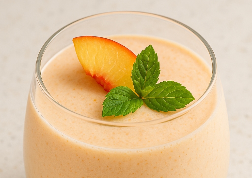 Διακόσμηση: Γαρνίρετε με λεπτές φέτες φρέσκου ροδάκινου ή φύλλα δυόσμου για φρεσκάδα.