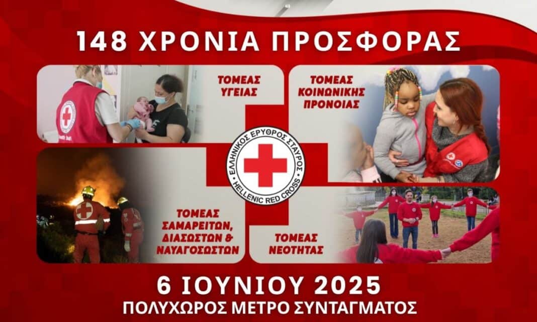 O Ελληνικός Ερυθρός Σταυρός, με αφορμή τη συμπλήρωση 148 ετών από την ίδρυσή του (10 Ιουνίου), θα πραγματοποιήσει την Παρασκευή 6 Ιουνίου 2025, και ώρες 09:00 – 21:00, μεγάλη εκδήλωση-έκθεση για μικρούς και μεγάλους, με τίτλο «Ελληνικός Ερυθρός Σταυρός – 148 χρόνια προσφοράς», στον Πολυχώρο Εκδηλώσεων του Μετρό Συντάγματος.