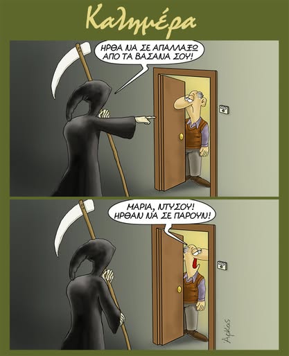 Ο γνωστός σκιτσογράφος Αρκάς επιστρέφει με μια ακόμη γερή δόση καυστικού χιούμορ, αυτή τη φορά μέσα από ένα απολαυστικό σκίτσο που δημοσιεύτηκε την Παρασκευή. Με φόντο τη παρουσία του Χάρου, το χιούμορ γίνεται μέσο ανάδειξης της καθημερινής, ίσως και πικρής, αλήθειας των ανθρώπινων σχέσεων που μετά από χρόνια βασίζεται περισσότερο στη συνήθεια παρά στην αγάπη.