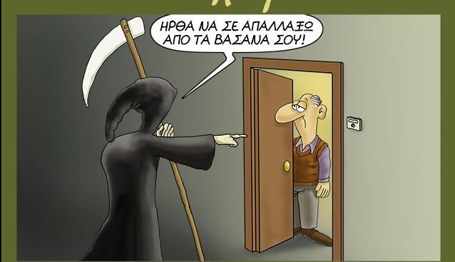 Στο εν λόγω σκίτσο, ο Χάρος εμφανίζεται στην πόρτα ενός άνδρα λέγοντάς του: «Ήρθα να σε απαλλάξω από τα βάσανά σου!» Ο άνδρας, χωρίς να δείχνει έκπληξη ή φόβο, στρέφεται προς το εσωτερικό του σπιτιού και φωνάζει: «Μαρία, ντύσου! Ήρθαν να σε πάρουν!»