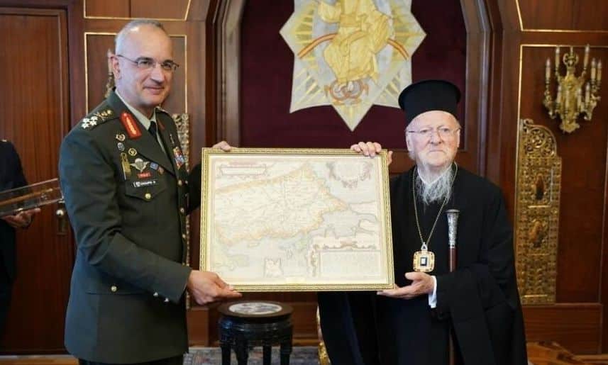 «Ο χάρτης τον οποίο επέδωσε ο Αρχηγός ΓΕΕΘΑ Στρατηγός Δημήτριος Χούπης στον Οικουμενικό Πατριάρχη κ. κ. Βαρθολομαίο, κατά την επίσκεψή του στην Κωνσταντινούπολη, στο πλαίσιο της 18ης Συνόδου των Αρχηγών Ενόπλων Δυνάμεων των Βαλκανικών χωρών, είναι ο χάρτης “Thraciae Veteris Typus” του 1585 μ.Χ. ο οποίος έχει σχεδιαστεί από τον Φλαμανδό χαρτογράφο και γεωγράφο Αβραάμ Ορτέλιους (Abraham Οrtelius).