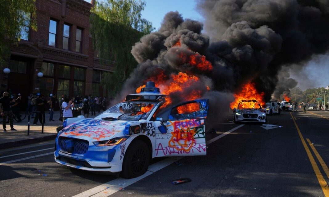 Τα αυτοκίνητα που πυρπολήθηκαν είναι αυτόνομα οχήματα της Waymo, όπως δείχνουν εικόνες που μεταδόθηκαν από το κανάλι BBC News. Τουλάχιστον τέσσερα έχουν πάρει φωτιά, με σπασμένα παράθυρα και βαμμένα με σπρέι.