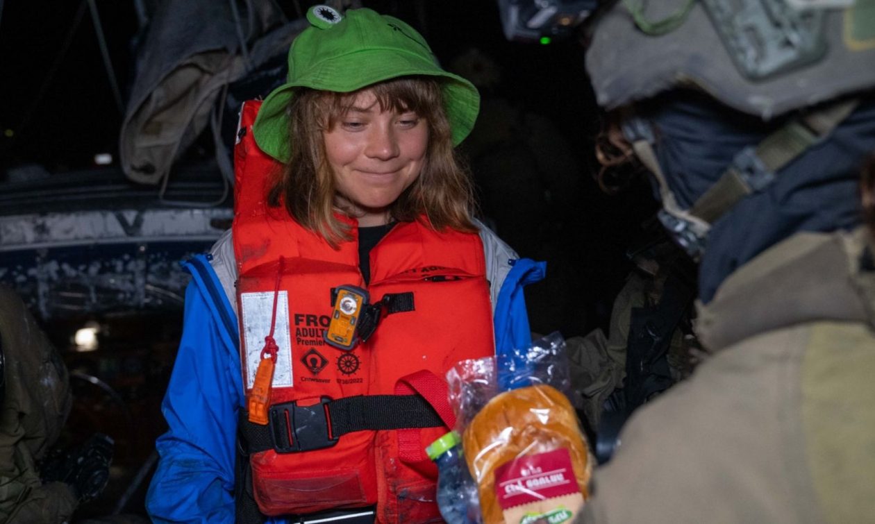 Η λεζάντα κάτω από τη φωτογραφία, η οποία δείχνει έναν στρατιώτη της Shayetet 13 να της παραδίδει ένα «δέμα με ανθρωπιστική βοήθεια», αναφέρει: «Η Γκρέτα Τούνμπεργκ βρίσκεται τώρα καθ’ οδόν προς το Ισραήλ, ασφαλής και σε καλή διάθεση».