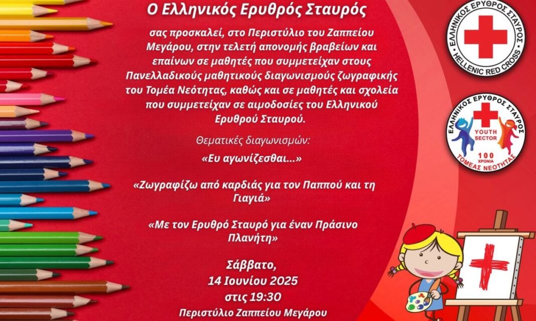 Ο Ελληνικός Ερυθρός Σταυρός, το Σάββατο, 14 Ιουνίου 2025, στις 19:30, στο Περιστύλιο του Ζαππείου Μεγάρου, διοργανώνει Τελετή Απονομής Βραβείων σε μαθητές από σχολεία όλης της Ελλάδος που διέπρεψαν στους τρεις Πανελλαδικούς διαγωνισμούς που διοργάνωσε ο Τομέας Νεότητάς του, καθώς και σε μαθητές και σχολεία που συμμετείχαν σε αιμοδοσίες του Ελληνικού Ερυθρού Σταυρού.