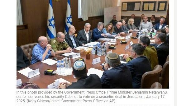 Σε αυτή τη φωτογραφία που παρέχει το Γραφείο Τύπου της Κυβέρνησης, ο πρωθυπουργός Μπέντζαμιν Νετανιάχου, στο κέντρο, συγκαλεί το υπουργικό συμβούλιο ασφαλείας για να ψηφίσει συμφωνία κατάπαυσης του πυρός στην Ιερουσαλήμ, στις 17 Ιανουαρίου 2025. (Koby Gideon/Γραφείο Τύπου της ισραηλινής κυβέρνησης μέσω AP)