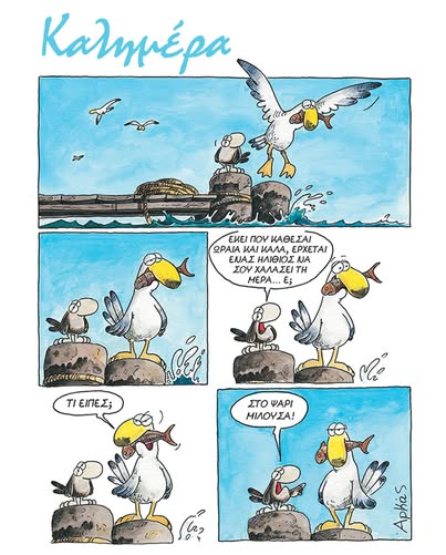 Με το χαρακτηριστικό του χιούμορ, ο Αρκάς, μάς λέει «Καλημέρα» μέσα από το σημερινό του σκίτσο, γεμάτο καλοκαιρινή αύρα και αιχμηρό σχόλιο για τις απρόσμενες «παρεμβάσεις» που μπορεί να σου χαλάσουν τη μέρα. Δύο πουλιά, καθισμένα ήσυχα στην προκυμαία, βλέπουν έναν τρίτο να εισβάλλει φουριόζος στη σκηνή. Το μικρότερο σχολιάζει: «Εκεί που κάθεσαι ωραία και καλά, έρχεται ένας ηλίθιος να σου χαλάσει τη μέρα, ε;», για να δεχτεί την απορημένη αντίδραση του μεγαλύτερου. Η ατάκα-ανατροπή δεν αργεί: «Στο ψάρι μιλούσα!».