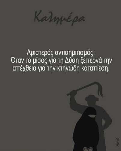 Στο σκίτσο της ημέρας, ο δημιουργός καταπιάνεται με τον αντισημιτισμό που εντοπίζει σε μερίδα της Αριστεράς, τον οποίο περιγράφει ως αποτέλεσμα ενός έντονου αντιαμερικανισμού και αντιδυτισμού. Όπως σημειώνει στο κείμενο που συνοδεύει την εικόνα ο «Αριστερός αντισημιτισμός: Όταν το μίσος για τη Δύση ξεπερνά την απέχθεια για την κτηνώδη καταπίεση.»
