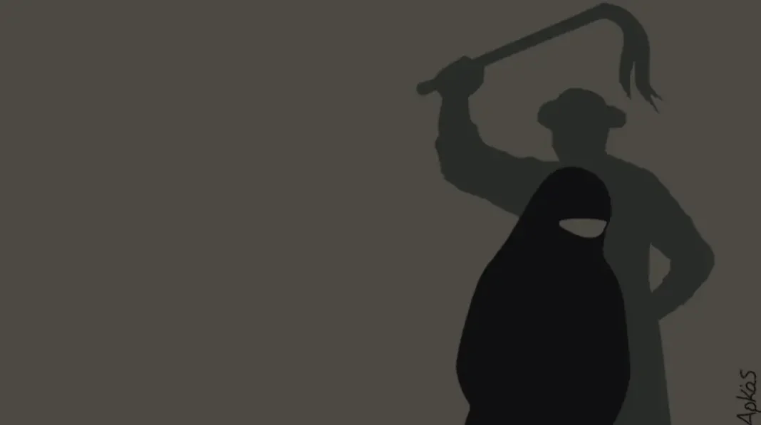 Η εικόνα απεικονίζει μια φιγούρα ντυμένη με μπούρκα μπροστά από μια μορφή που κρατά απειλητικά ένα μαστίγιο, δίνοντας οπτική έκφραση στην έννοια της καταπίεσης. Το σχόλιο του σκιτσογράφου φαίνεται να στηλιτεύει τη στάση όσων, όπως υπονοείται, δείχνουν ανοχή ή ακόμα και υποστήριξη σε αυταρχικά καθεστώτα λόγω της απέχθειάς τους για τη Δύση.
