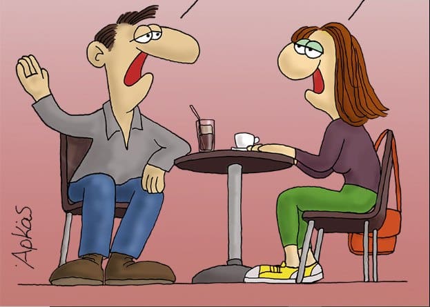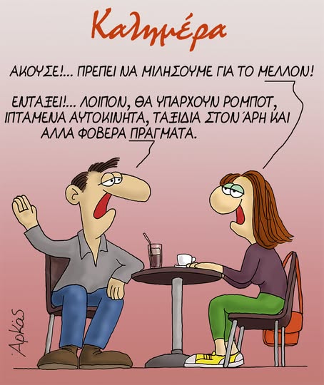 Με μια κούπα καφέ μπροστά τους, οι πρωταγωνιστές του σκίτσου μας χαρίζουν άλλη μία στιγμή αναγνώρισης και γέλιου. Γιατί τελικά, το μέλλον μπορεί να είναι γεμάτο τεχνολογίες… αλλά οι ανθρώπινες σχέσεις παραμένουν διαχρονικά περίπλοκες!