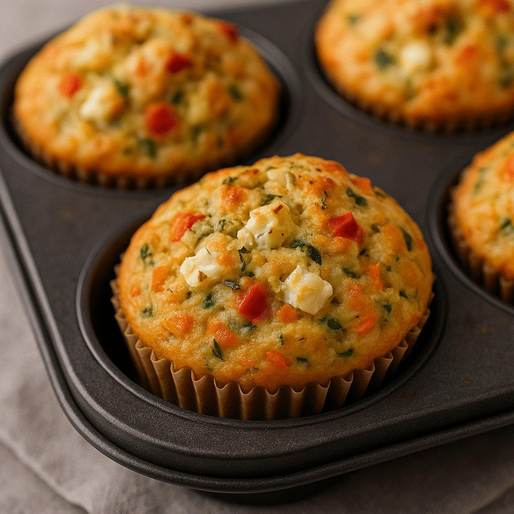 Αυτά τα αλμυρά μάφιν είναι ο ιδανικός συνδυασμός αφράτης υφής, πλούσιας γεύσης φέτας και φρέσκων λαχανικών. Ιδανικά για πρωινό, brunch, αλλά και ως σνακ για το γραφείο ή το σχολείο. Ετοιμάζονται εύκολα και είναι μια εξαιρετική επιλογή για να αξιοποιήσεις λαχανικά που σου περισσεύουν!