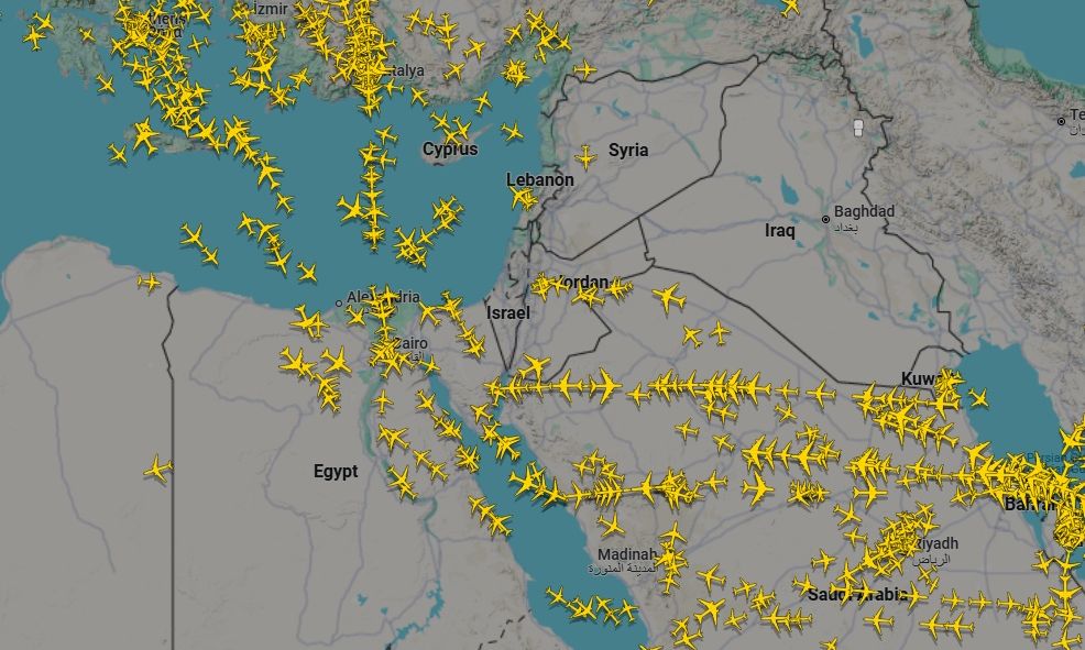 Ο ιστότοπος παρακολούθησης πτήσεων FlightRadar24 έδειξε ότι οι αεροπορικές εταιρείες δεν πραγματοποιούν πτήσεις στον εναέριο χώρο του Ιράν, του Ιράκ, της Συρίας και του Ισραήλ