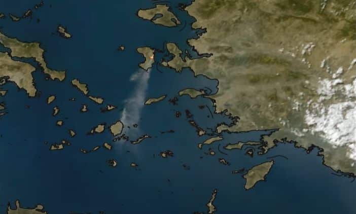Η φωτιά στην Χίο όπως φαίνεται από δορυφόρο – Έφτασαν στις Κυκλάδες οι καπνοί