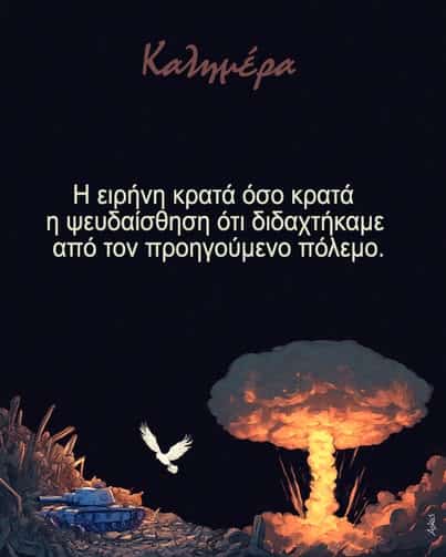 Το μήνυμα που συνοδεύει την εικόνα είναι εξίσου δυνατό: «Η ειρήνη κρατά όσο κρατά η ψευδαίσθηση ότι διδαχτήκαμε από τον προηγούμενο πόλεμο.»