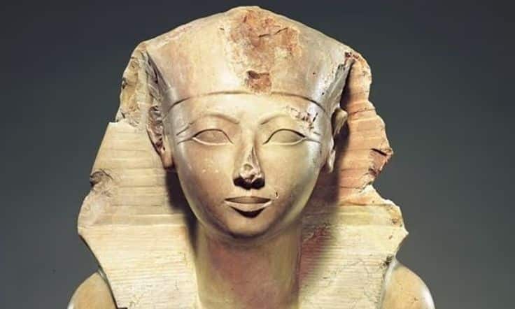 Η ιστορία λέει ότι μετά τον θάνατό της το 1458 π.Χ., ο ανιψιός και διάδοχός της, Θουτμόσης Γ΄, ξεκίνησε εκστρατεία για την εξάλειψη της μνήμης της: τα αγάλματά της καταστράφηκαν, το όνομά της σβήστηκε από μνημεία και το πρόσωπό της εξαφανίστηκε από τις τοιχογραφίες.