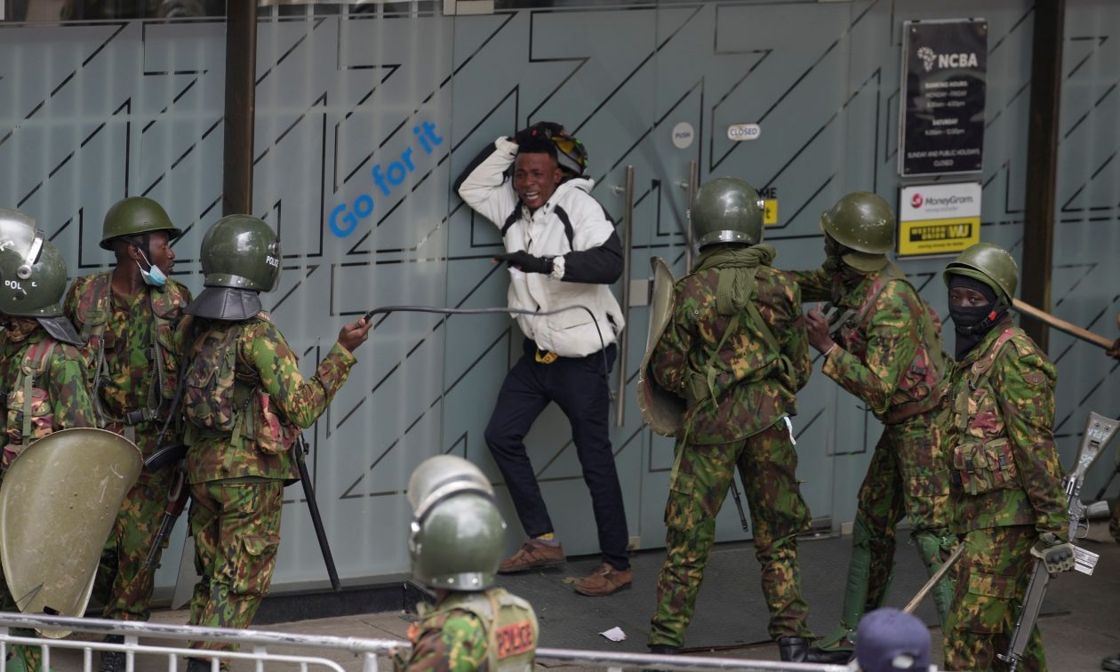 Ένας αστυνομικός της Κένυας χτυπά με μαστίγιο έναν διαδηλωτή κατά τη διάρκεια διαδήλωσης στο κέντρο του Ναϊρόμπι, Κένυα, Τετάρτη, 25 Ιουνίου 2025.