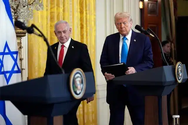 Επαίνεσε τον Νετανιάχου ως «πολεμιστή» χωρίς προηγούμενο στην ιστορία του Ισραήλ, και διαβεβαίωσε πως καμία άλλη συνεργασία δεν ήταν τόσο αρμονική όσο η δική τους. «Οι ΗΠΑ έσωσαν το Ισραήλ και τώρα θα σώσουν τον Μπίμπι», τόνισε, καταγγέλλοντας την ποινική διαδικασία ως «παρωδία ‘δικαιοσύνης’».