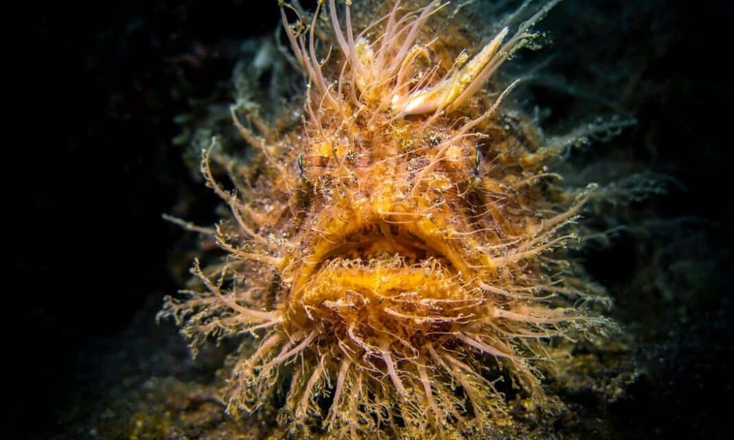 Το τριχωτό βατραχόψαρο μοιάζει περισσότερο με μια τούφα από φύκια παρά με θηρευτή. Κάτω από αυτή τη μπάλα νημάτων, κρύβεται ένα ψάρι που μπορεί να «εισπνεύσει» το θήραμά του γρηγορότερα από ό, τι οι περισσότερες κάμερες μπορούν να αναβοσβήνουν.