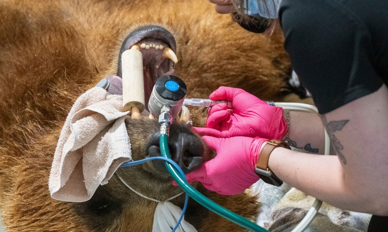 Ο Tundra, ένας 6χρονος καφέ αρκούδος της Αλάσκας, υποβλήθηκε σε επέμβαση για την τοποθέτηση ενός νέου μεταλλικού κυνόδοντα, τη Δευτέρα 23 Ιουνίου 2025, στο ζωολογικό κήπο του Duluth, Μινεσότα.