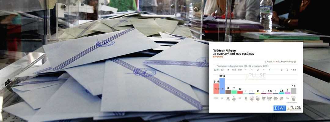 Προβάδισμα της ΝΔ κατά 9% έναντι του ΣΥΡΙΖΑ για τις Ευρωεκλογές και 9,5% για τις εθνικές εκλογές καταγράφει δημοσκόπηση της Pulse για τον ΣΚΑΙ.