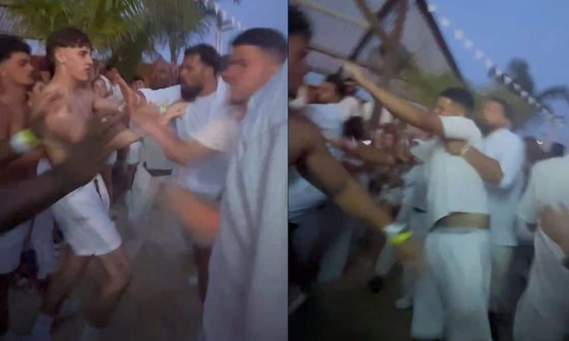 Σύμφωνα με το βίντεο που κυκλοφορεί ευρέως στο διαδίκτυο, δύο νεαροί –ημίγυμνοι και ντυμένοι με λευκά σορτς– επιτίθενται σε μεγαλύτερης ηλικίας άνδρες, οι οποίοι επίσης συμμετείχαν στο θεματικό event με αντίστοιχο dress code. Η κατάσταση ξεφεύγει γρήγορα, με έναν από τους εμπλεκόμενους να κλωτσά με δύναμη κάποιον άλλο στο στήθος, προκαλώντας αναστάτωση στο πλήθος.