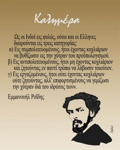 Στη σημερινή του καλημέρα, ο Αρκάς, επέλεξε να δανειστεί λόγια του Εμμανουήλ Ροΐδη που παραμένουν διαχρονικά επίκαιρα. Με χαρακτηριστικό σκωπτικό ύφος, το σκίτσο σχολιάζει την ελληνική κοινωνία, χωρίζοντάς την σε τρεις κατηγορίες πολιτών – με έμφαση στις σχέσεις εξουσίας και εξάρτησης από τον κρατικό κορβανά.