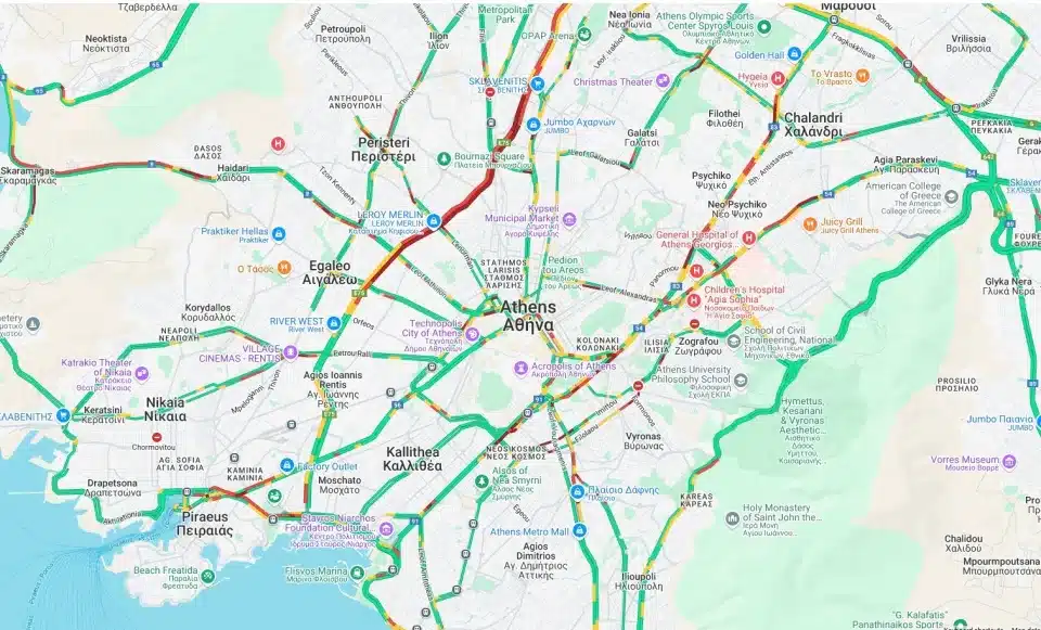 Αναλυτικότερα, αυξημένη είναι η κίνηση στην Αθηνών-Κορίνθου/Λ. Αθηνών στο ρεύμα εξόδου από το Δαφνί έως τα Διυλιστήρια, στην Αθηνών-Κορίνθου/Λ. Αθηνών στο ρεύμα εισόδου, στην Αθηνών-Λαμίας (Αθηνών έως κόμβος Καλυφτάκη -έξοδος) από την Λεωφόρο Αθηνών έως την Αχαρνών, αλλά και στην Αθηνών-Λαμίας (κόμβος Καλυφτάκη έως Αθηνών-είσοδος) από Μεταμόρφωση έως Λένορμαν.